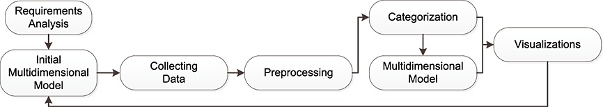 The load of the initial data, and especially the analysis and processing of the different data sources, led us to the emergence of new elements that altered the structure of the analysis, thus requiring to repeatedly adapt and update the data modelling scheme. As it is common to discover new elements and relevant information as highly heterogeneous sources are explored, we adopted an iterative procedure to tackle this problem. This procedure can be seen in Figure 1. Initially, data are gathered from each data source. Then they are preprocessed according to a certain set of rules, that is, regular expressions that ensure that data format is correct, null values filtered out and so on. Finally, data are visualized either directly, in a stand-alone way, to evaluate its quality or to provide further understanding, or they are integrated within the multidimensional model, leading to a new version of the model. Then, the new multidimensonal model is visualized in order to evaluate the result of the integration step. Afterwards, the cycle starts again, using the newly gained understanding to perform modifications on the procedure steps, that is, ETL processes and natural language processes.