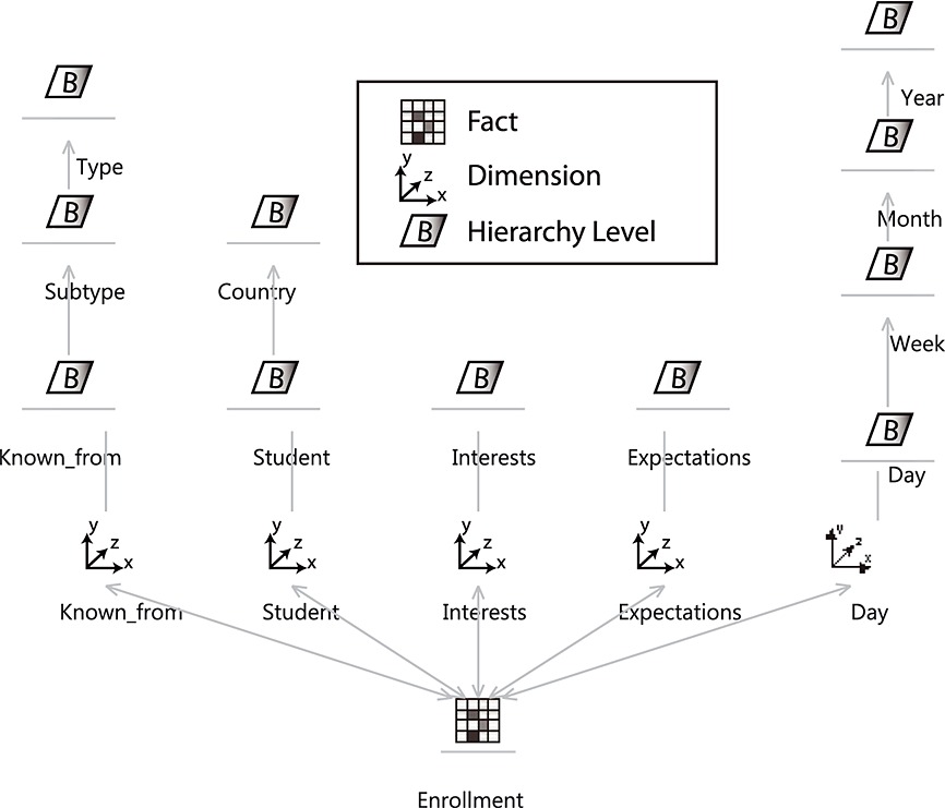 This multidimensional model was created by using the conceptual modelling proposal described in (Lujan-Mora et al., 2006), where the information is organized according to facts (centre of analysis) and dimensions (context of analysis) as shown in Figure 2. Here, we can see the centre of the analysis (fact), which is the ‘enrollment’ process. According to our data as well as our user analysis needs, there are several concepts related to enrollment that are relevant and represent the context of analysis (dimensions). First, we have the ‘known from’ dimension. This dimension gathers information about how a student knew about the existence of the course. According to the categorization process performed, we can differentiate between ‘subtype’ and ‘type’ aggregation levels. ‘Subtype’ contains categories such as ‘newspaper’ or ‘online’, which can be further grouped into ‘type’, such as ‘news’. Next, we have ‘students’. This dimension gathers the information regarding the different students who enrol in the course. As we were not interested in analysing the personal data of individual students, we have grouped them by ‘country’.