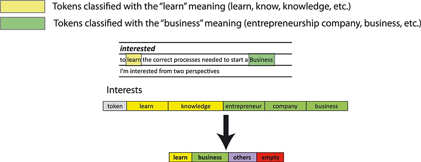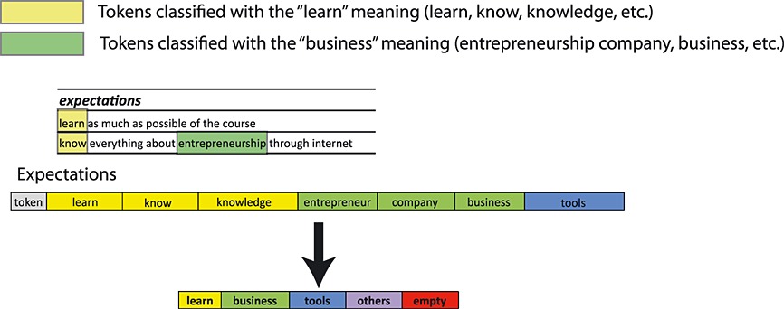 An example of this procedure showing the process for the expectations and interests dimensions of the enrollment modelling can be seen in Figures 4 and 5. We can appreciate on the left side the procedure where the tokens are extracted from the text. On the right side, the categorization is carried out by grouping similar semantic meaning in natural language.