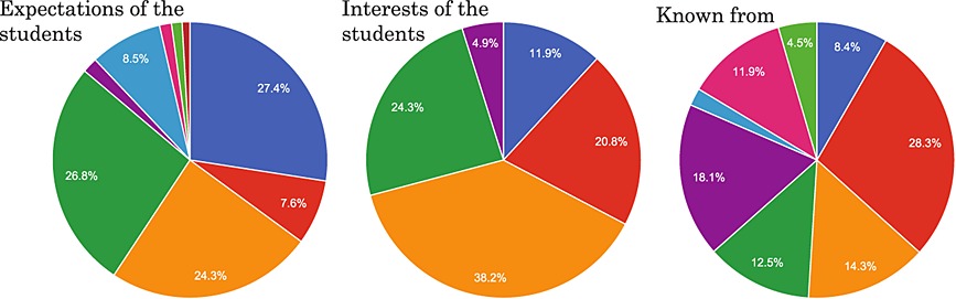 Because of the big amount of data of this course, the best way to analyse these data was by using simple and clear visualization methods. Figure 6 shows three pie charts where the division into sectors is crucial to illustrate numerical proportions. We have to take into account that in both Figures 6 and 7, the datasets that are analysed contain only the data related to students before the course started. This is important to find out the expectations, interests and so on from the students in order to improve the courses, especially in future editions.