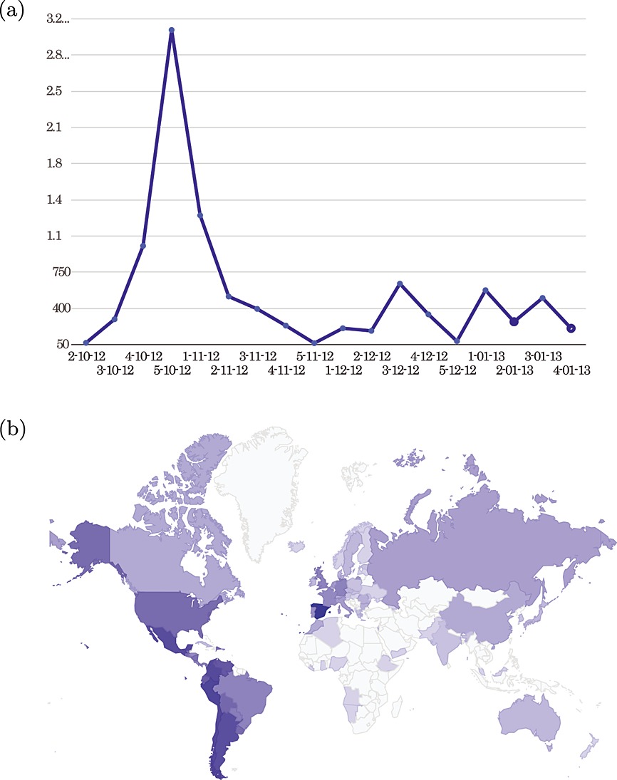 Figure 7 allows us to see the quantity of enrollment per day. It is obvious to note that the last dates before the deadline as well as those extra days if the deadline has been extended have a higher number of students. The second part of Figure 7, the map, represents the origin of the students. Here, we can also note that the countries with Spanish as the official language are the ones with the largest number of enrollments.